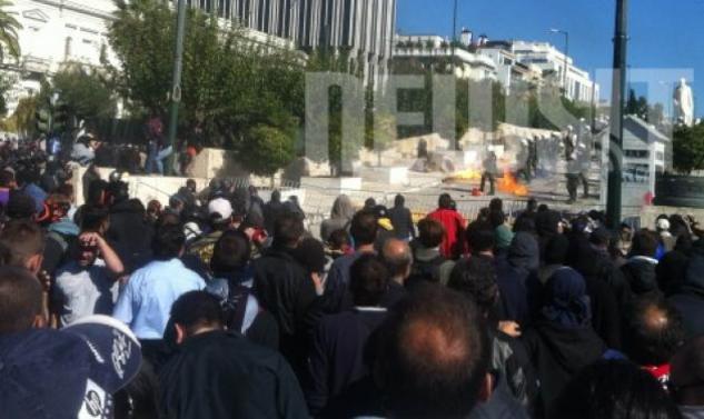 Λίγο μετά τις 13:30, διαδηλωτές επιχείρησαν να ρίξουν το φράκτη που έχει στηθεί στη Βασιλίσσης Σοφίας, μπροστά από τη Βουλή. Οι αστυνομικοί δεν έκαναν ευρείας χρήση δακρυγόνων παραμόνο για να απωθήσουν τους διαδηλωτές.
