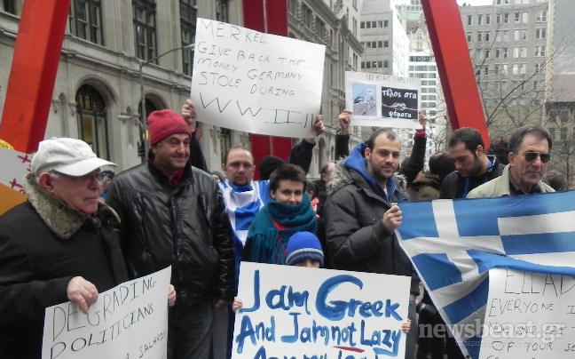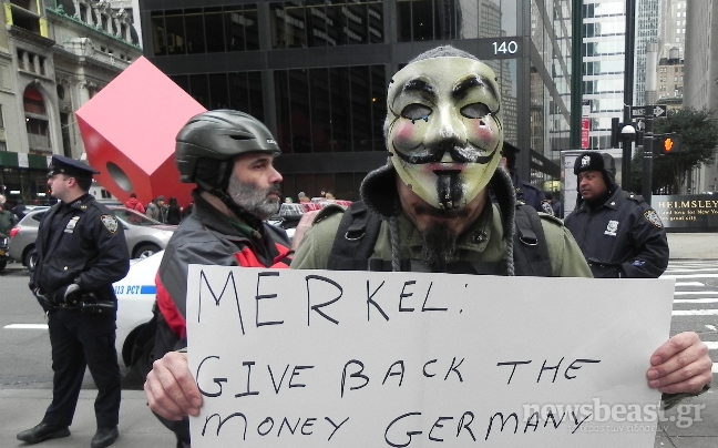 Οι διαδηλωτές κρατούσαν ελληνικές σημαίες και βροντοφώναξαν υπέρ της χώρας μας. Τα πλακάτ που κρατούσαν οι συγκεντρωμένοι στρέφονταν κατά των αγορών, ενώ την… τιμητική της είχε και η Άνγκελα Μέρκελ, την οποία καλούσαν οι διαδηλωτές να επιστρέψει τα χρήματα που έκλεψαν οι Γερμανοί κατά τον Β’ Παγκόσμιο Πόλεμο.