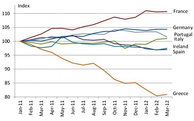 Πορτογαλία, Ιρλανδία, Ισπανία και Ιταλία που επίσης βρίσκονται σε οικονομικές δυσκολίες εμφανίζουν διακυμάνσεις στον σχετικό δείκτη, όμως καμία δεν ακολουθεί την πορεία της Ελλάδας...